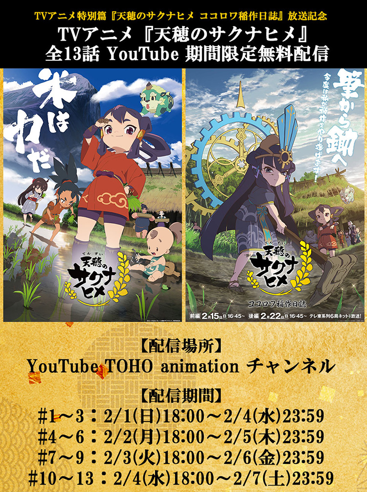 TVアニメ特別篇『天穂のサクナヒメ ココロワ稲作日誌』放送を記念し、YouTube TOHO animationチャンネルにて期間限定無料配信が決定しました!